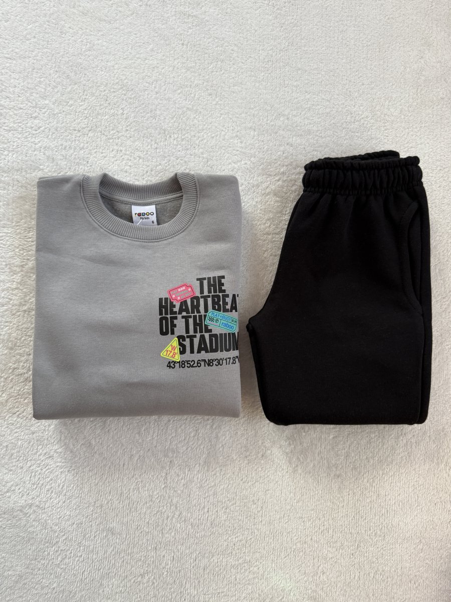 Άνετο και στιλάτο σετ με γκρι μπλούζα και μαύρο παντελόνι. Μοναδική στάμπα στην πλάτη εμπνευσμένη από τον παλμό του σταδίου – ιδανικό για παιδιά που αγαπούν την ενέργεια και το παιχνίδι