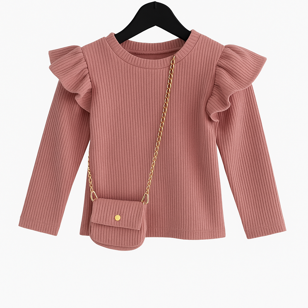 Κομψό και παιχνιδιάρικο σετ για τις μικρές fashionistas! Αποτελείται από μπλούζα με βολάν στα μανίκια και παντελόνι καμπάνα, σε υπέροχη ροζ πούδρα απόχρωση με ριγέ υφή. Το σετ ολοκληρώνεται με το πιο γλυκό αξεσουάρ – ένα μικρό τσαντάκι ώμου με χρυσή αλυσίδα. Άνετο, στυλάτο και ιδανικό για όλες τις περιστάσεις. Διαθέσιμο σε μεγέθη 1 έως 6 ετών.