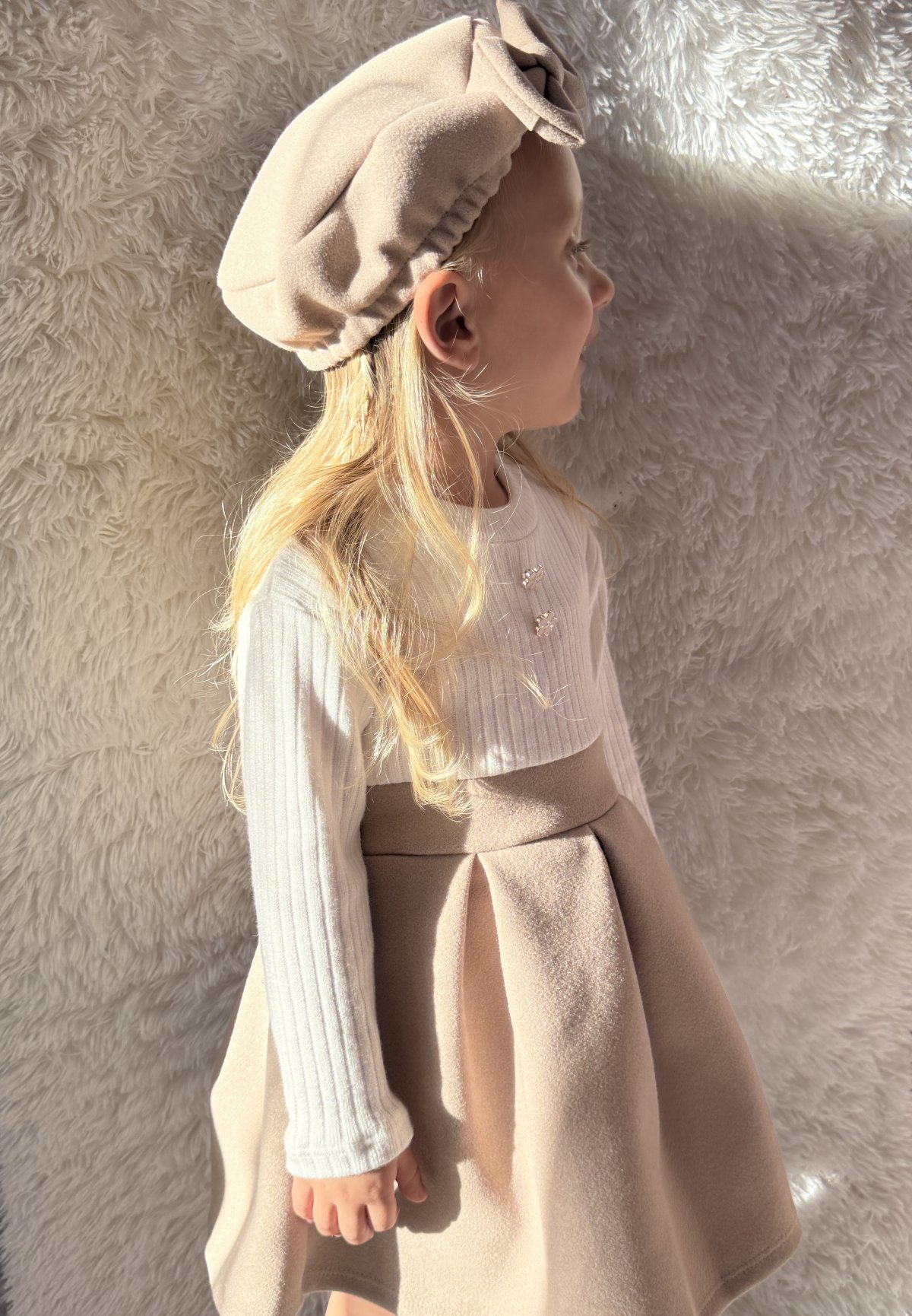 Το πάνω μέρος είναι πλεκτό, σε απαλό εκρού χρώμα, ενώ η φούστα σε ζεστή μπεζ απόχρωση.