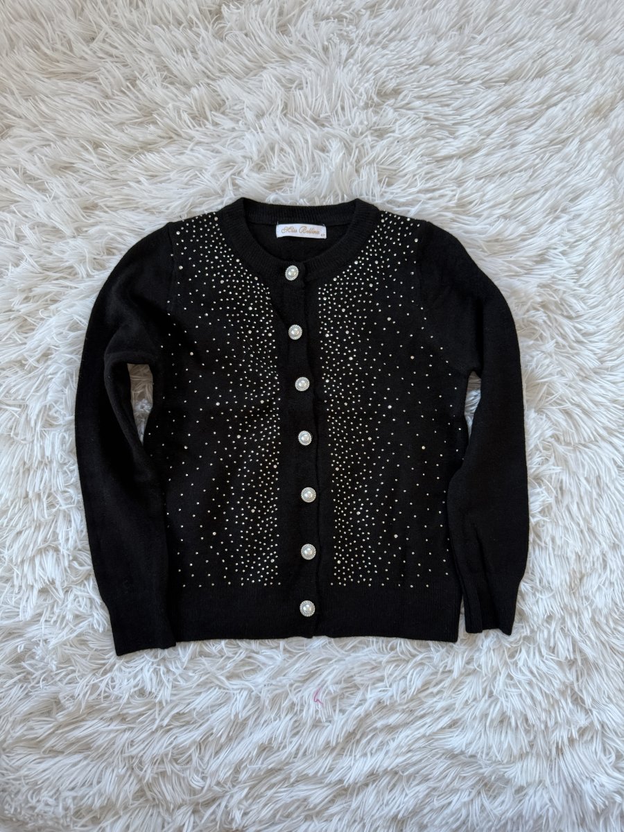 Κομψή παιδική ζακέτα για κορίτσια, σε μαύρο χρώμα, διακοσμημένη με λαμπερά στρας στο μπροστινό μέρος που προσθέτουν μία elegant πινελιά.