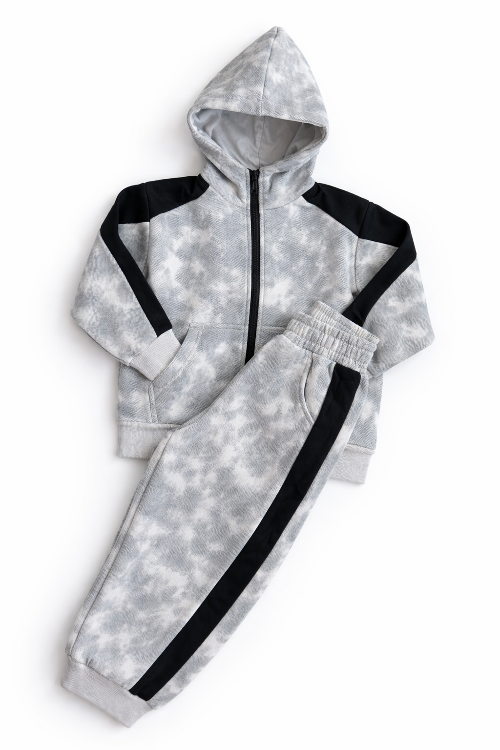 Παιδική φόρμα σετ σε γκρι αποχρώσεις, που αποτελείται από ζακέτα με κουκούλα και παντελόνι.