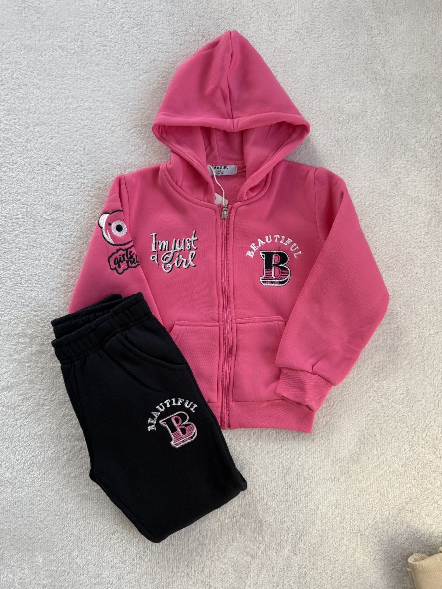 Σετ φόρμας για κορίτσια με φούξια ζακέτα φούτερ με κουκούλα και μπλε παντελόνι. Η ζακέτα διαθέτει τσέπες και φερμουάρ, με κεντημένη λεπτομέρεια “I’m just a Girl” και το γράμμα Β “Beautiful”. Το παντελόνι έχει ελαστική μέση και λάστιχα στο τελείωμα για άνεση και σταθερότητα. Ένα πρακτικό και στιλάτο σετ για το σχολείο και τις καθημερινές δραστηριότητες.