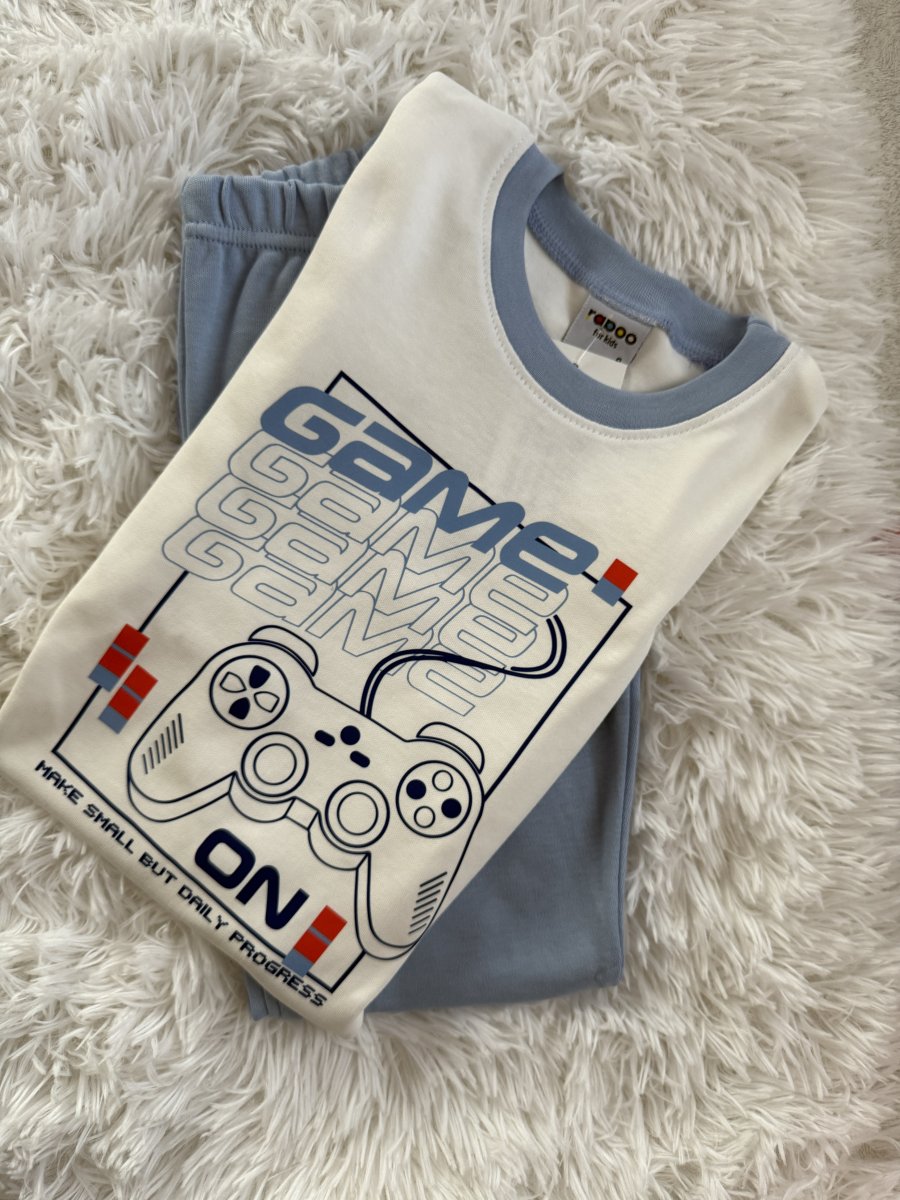 Παιδικό σετ με λευκή μπλούζα και γαλάζιο παντελόνι, με στάμπα video game και motivational μήνυμα – για μικρούς gamers με στυλ!