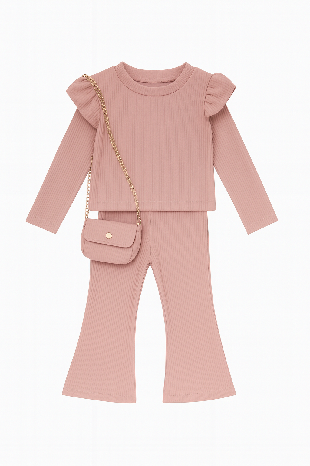 Κομψό και παιχνιδιάρικο σετ για τις μικρές fashionistas! Αποτελείται από μπλούζα με βολάν στα μανίκια και παντελόνι καμπάνα, σε υπέροχη ροζ πούδρα απόχρωση με ριγέ υφή. Το σετ ολοκληρώνεται με το πιο γλυκό αξεσουάρ – ένα μικρό τσαντάκι ώμου με χρυσή αλυσίδα. Άνετο, στυλάτο και ιδανικό για όλες τις περιστάσεις. Διαθέσιμο σε μεγέθη 1 έως 6 ετών.