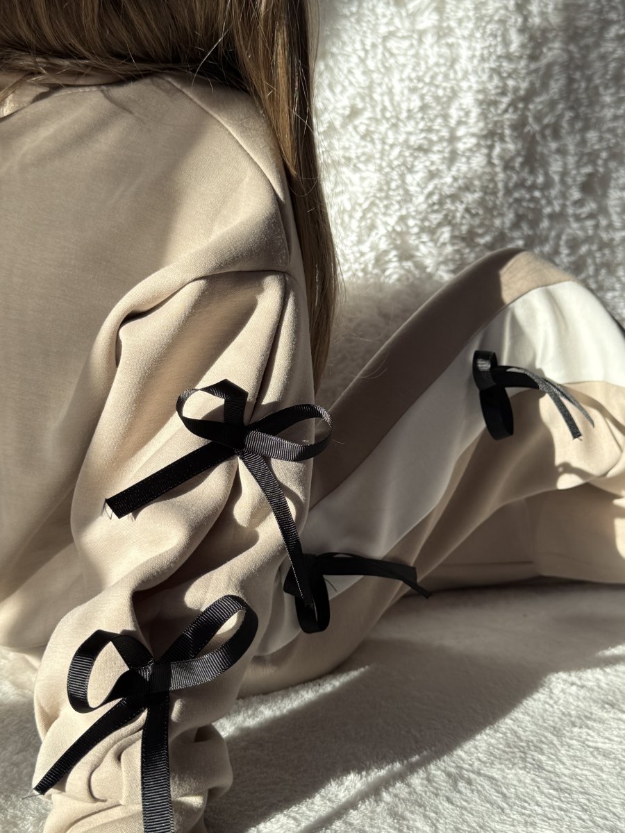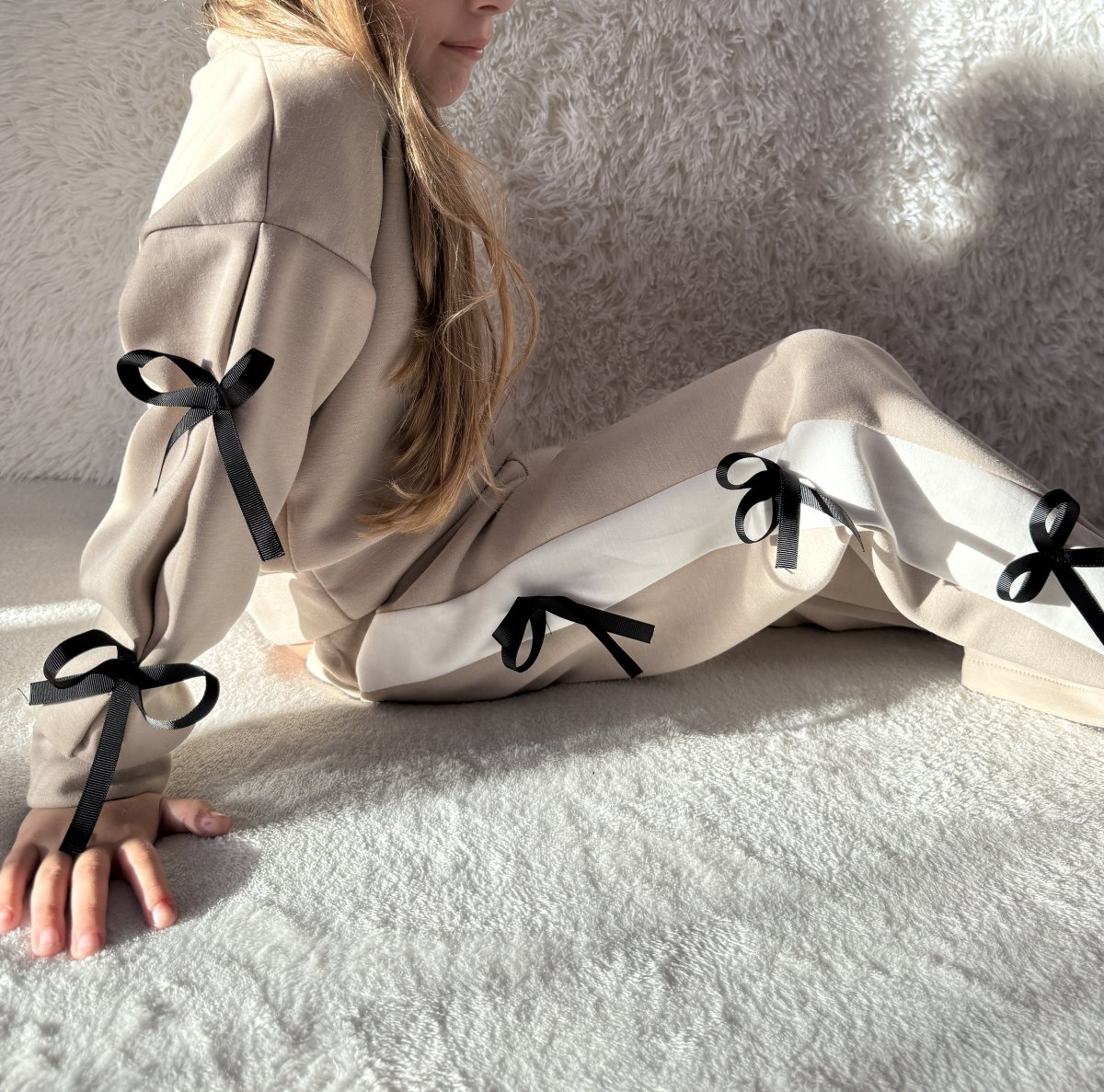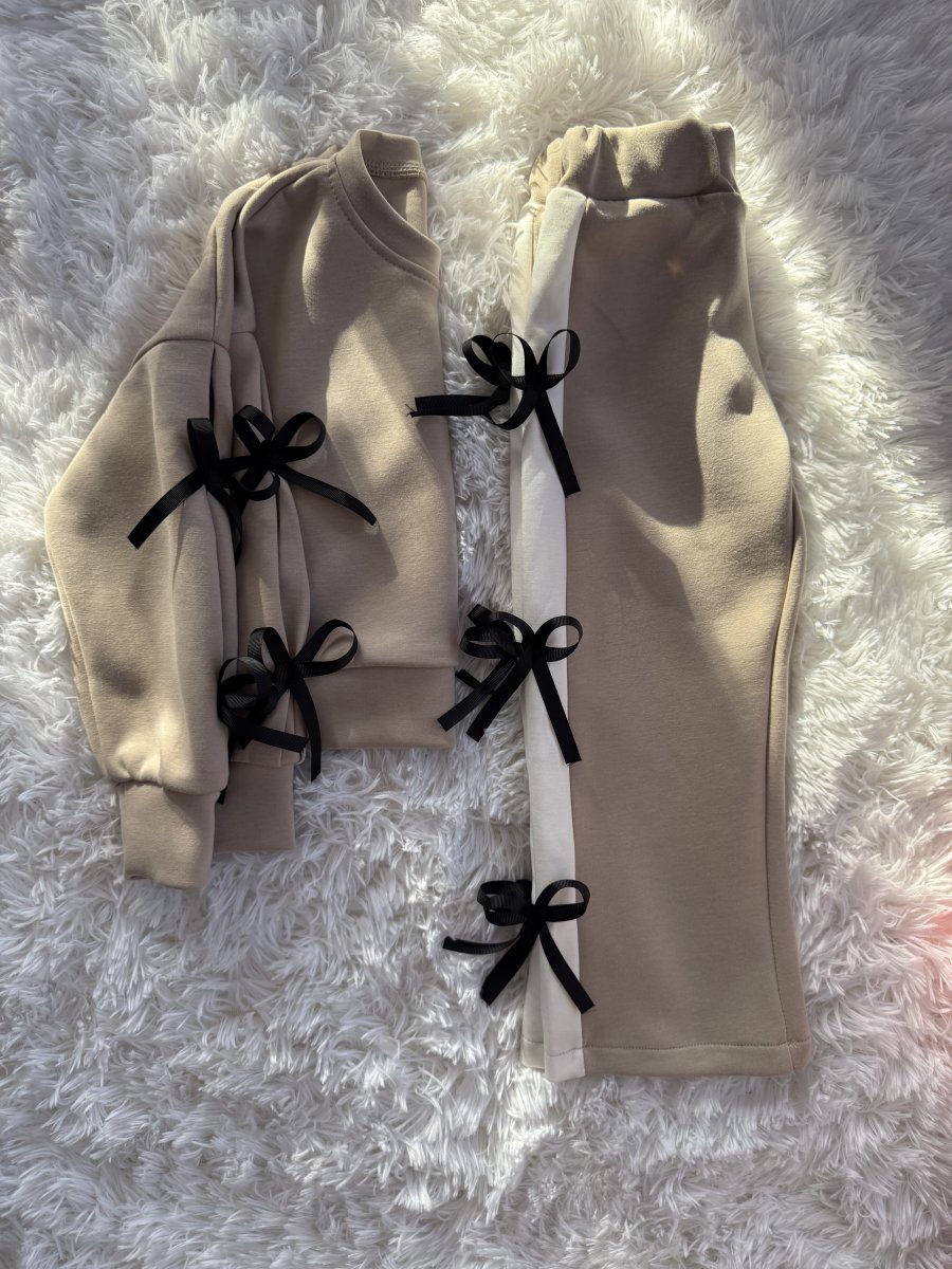 Παιδικό σετ σε απαλό μπεζ χρώμα με λευκές πλαϊνές ρίγες και μαύρους φιόγκους είναι η απόλυτη επιλογή για μικρές fashionistas που αγαπούν το κομψό και ξεχωριστό ντύσιμο.
