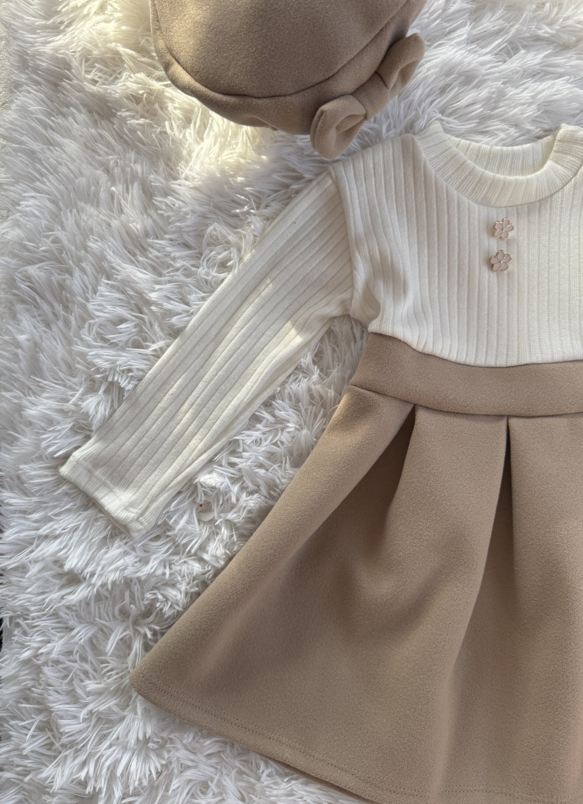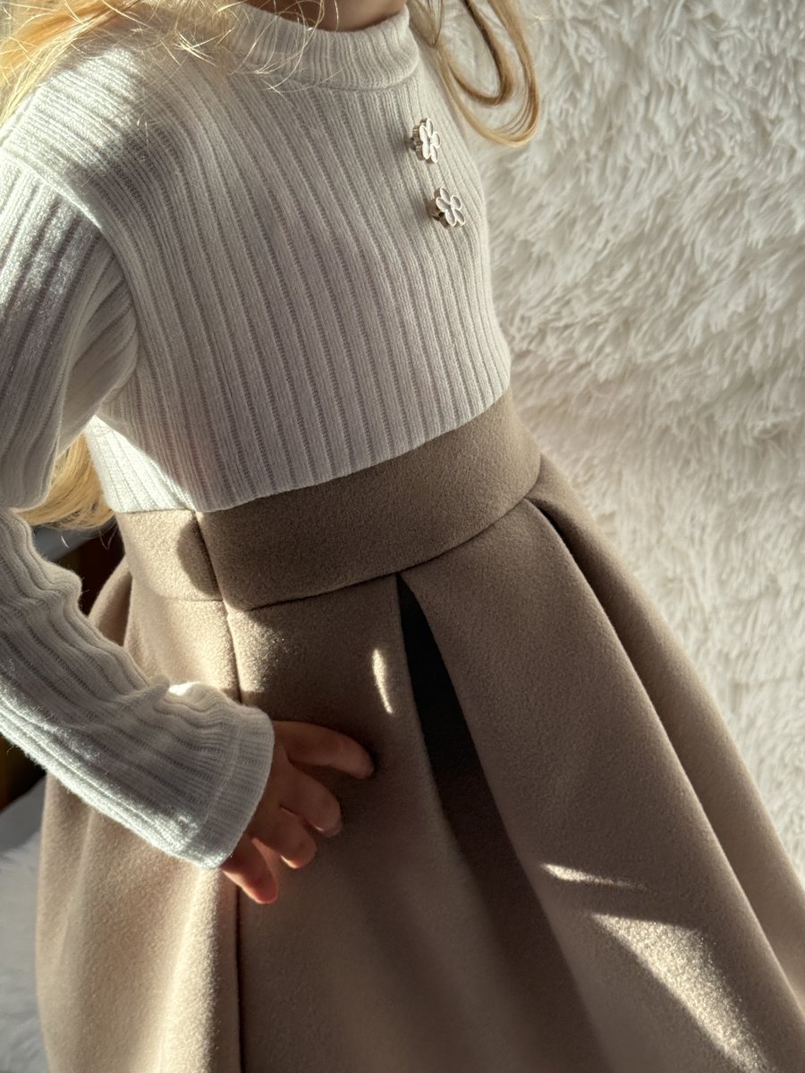 Το πάνω μέρος είναι πλεκτό, σε απαλό εκρού χρώμα, ενώ η φούστα σε ζεστή μπεζ απόχρωση.