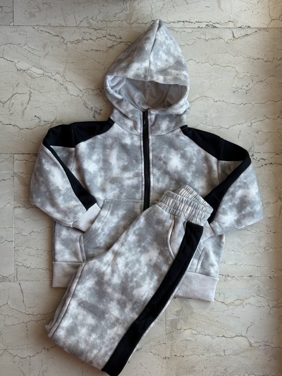 Παιδική φόρμα σετ σε γκρι αποχρώσεις, που αποτελείται από ζακέτα με κουκούλα και παντελόνι.