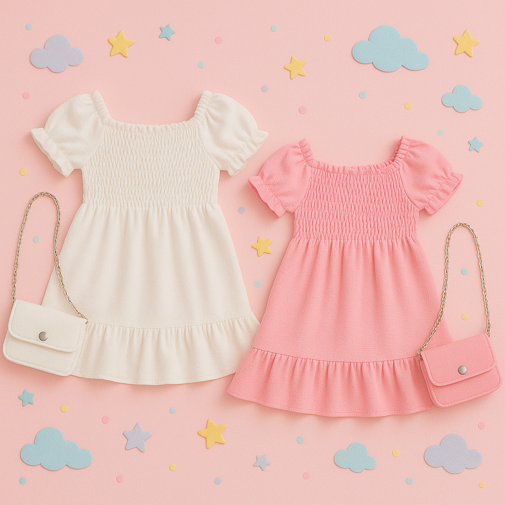 Ανάλαφρα και παιχνιδιαρικα φορεματάκια με φουσκωτα μανίκια και με ασορτί τσαντουλα για καθε μικρή κυρία.